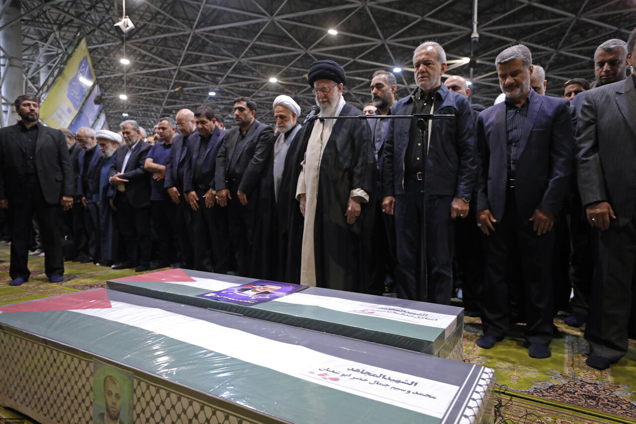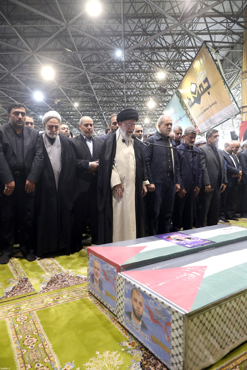 حضرت آیتالله خامنهای رهبر انقلاب اسلامی صبح امروز _پنجشنبه یازدهم مرداد_ در دانشگاه تهران بر پیکر شهید اسماعیل هنیه مجاهد برجسته مقاومت فلسطینی و محافظ ایشان، اقامه نماز کردند.