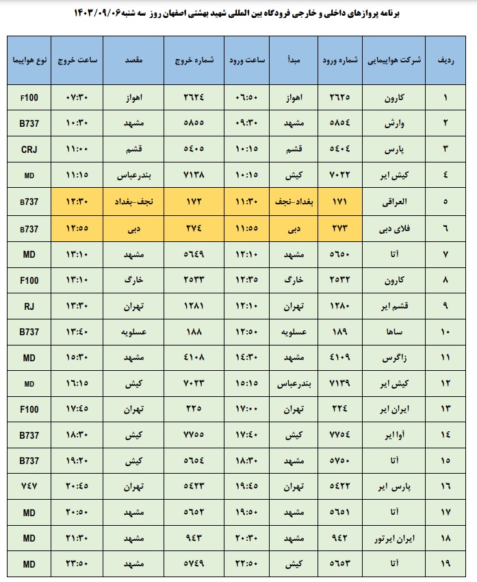به گزارش نبض وطن، اطلاعات پروازهای داخلی و خارجی فرودگاه بینالمللی شهید بهشتی اصفهان امروز _سهشنبه ششم آذر_ به شرح زیر است: