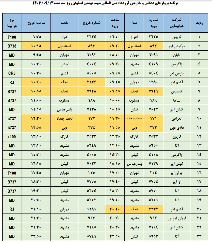 به گزارش نبض وطن، اطلاعات پروازهای داخلی و خارجی فرودگاه بینالمللی شهید بهشتی اصفهان امروز _سهشنبه سیزدهم آذر_ به شرح زیر است: