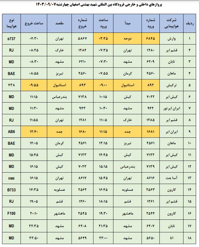 به گزارش نبض وطن، اطلاعات پروازهای داخلی و خارجی فرودگاه بینالمللی شهید بهشتی اصفهان امروز _چهارشنبه چهاردهم آذر_ به شرح زیر است: