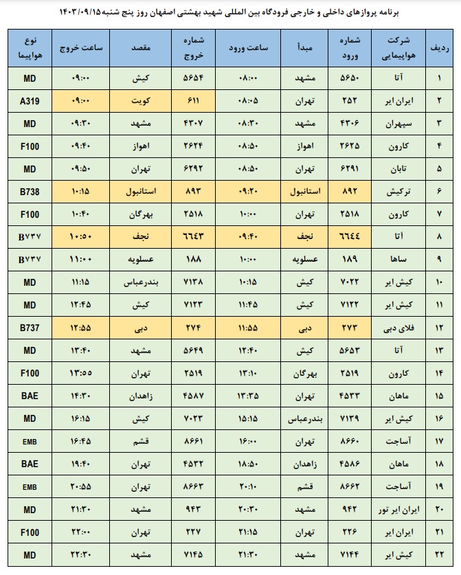 به گزارش نبض وطن، اطلاعات پروازهای داخلی و خارجی فرودگاه بینالمللی شهید بهشتی اصفهان امروز _پتجشنبه پانزدهم آذر_ به شرح زیر است: