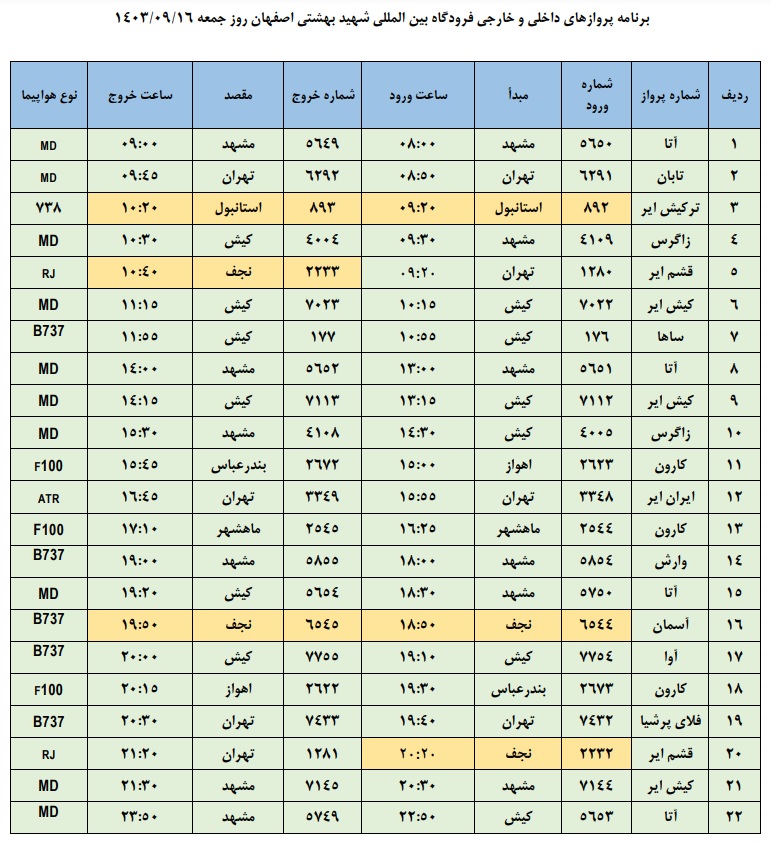 به گزارش نبض وطن، اطلاعات پروازهای داخلی و خارجی فرودگاه بینالمللی شهید بهشتی اصفهان امروز _جمعه شانزدهم آذر_ به شرح زیر است: