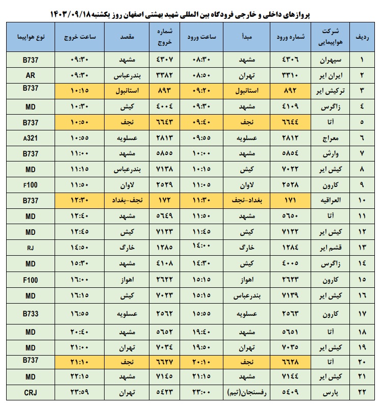 به گزارش نبض وطن، اطلاعات پروازهای داخلی و خارجی فرودگاه بینالمللی شهید بهشتی اصفهان امروز _یکشنبه هجدهم آذر_ به شرح زیر است: