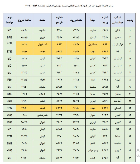 به گزارش نبض وطن، اطلاعات پروازهای داخلی و خارجی فرودگاه بینالمللی شهید بهشتی اصفهان امروز _دوشنبه نوزدهم آذر_ به شرح زیر است: