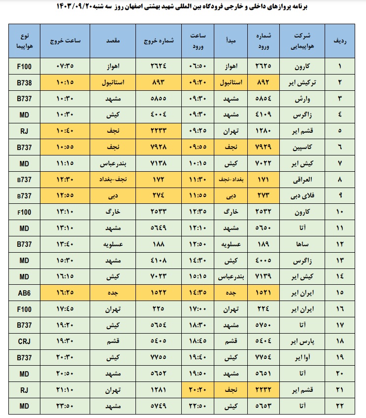به گزارش نبض وطن، اطلاعات پروازهای داخلی و خارجی فرودگاه بینالمللی شهید بهشتی اصفهان امروز _سهشنبه بیستم آذر_ به شرح زیر است: