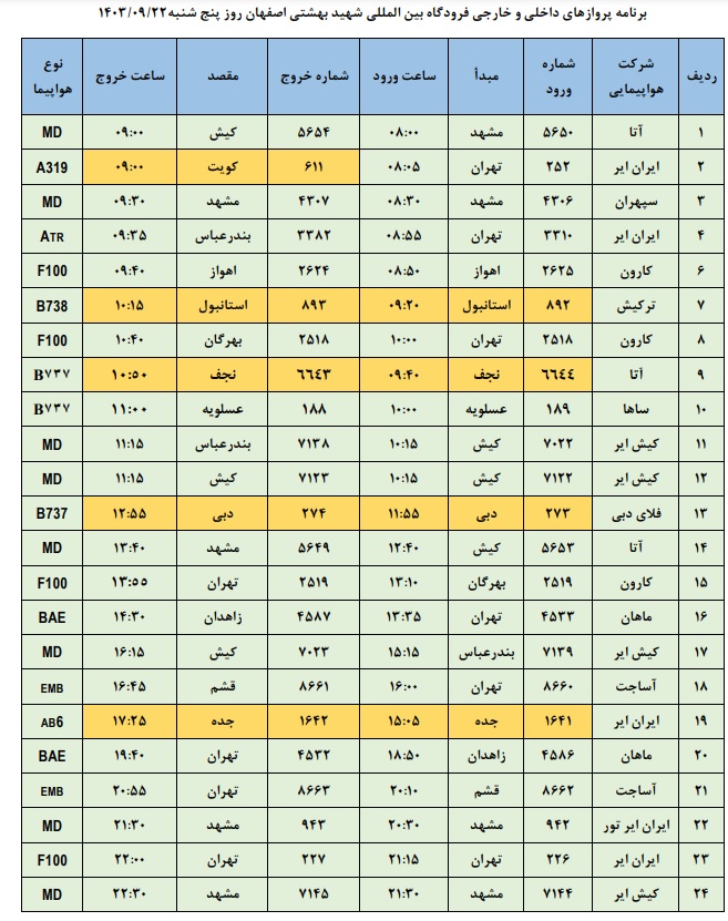 به گزارش نبض وطن، اطلاعات پروازهای داخلی و خارجی فرودگاه بینالمللی شهید بهشتی اصفهان امروز _پنجشنبه بیست ودوم آذر_ به شرح زیر است: