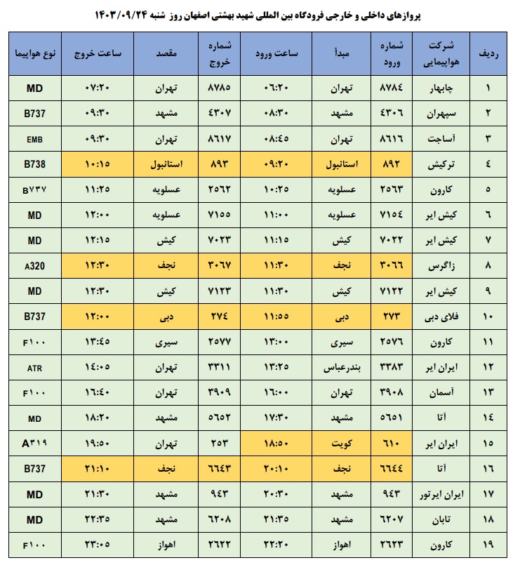 به گزارش نبض وطن، اطلاعات پروازهای داخلی و خارجی فرودگاه بینالمللی شهید بهشتی اصفهان امروز _شنبه بیست و چهارم آذر_ به شرح زیر است: