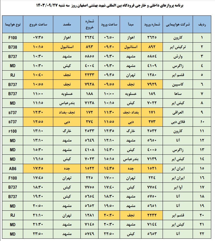 به گزارش نبض وطن، اطلاعات پروازهای داخلی و خارجی فرودگاه بینالمللی شهید بهشتی اصفهان امروز _سهشنبه بیست و هفتم آذر_ به شرح زیر است: