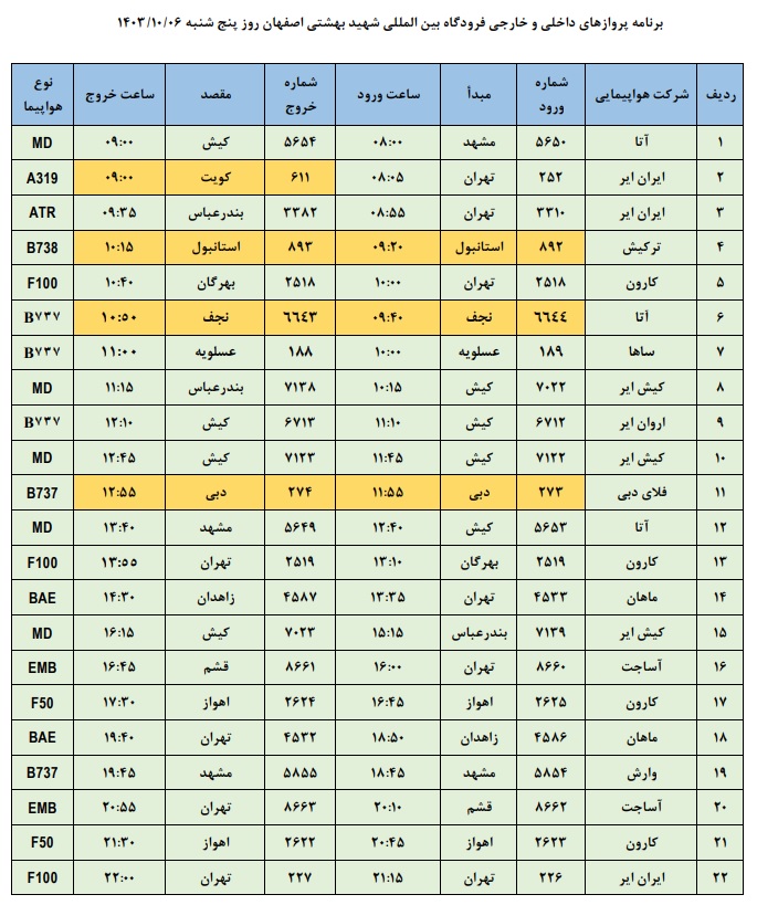 به گزارش نبض وطن، اطلاعات پروازهای داخلی و خارجی فرودگاه بینالمللی شهید بهشتی اصفهان امروز _پنجشنبه ششم دی ماه_ به شرح زیر است: