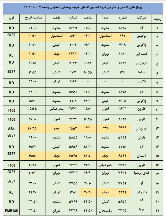 به گزارش نبض وطن، اطلاعات پروازهای داخلی و خارجی فرودگاه بینالمللی شهید بهشتی اصفهان امروز _جمعه هفتم دی ماه_ به شرح زیر است: