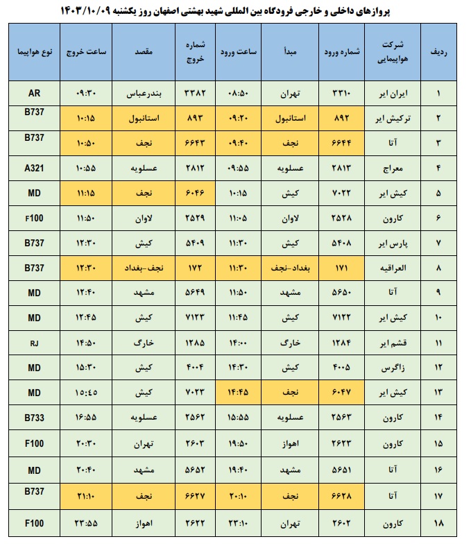 به گزارش نبض وطن، اطلاعات پروازهای داخلی و خارجی فرودگاه بینالمللی شهید بهشتی اصفهان امروز _یکشنبه نهم دی ماه_ به شرح زیر است: