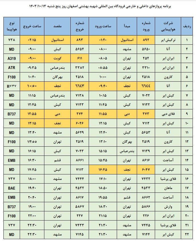 برنامه پروازهای داخلی و خارجی فرودگاه اصفهان امروز ۱۳ دی ۱۴۰۳