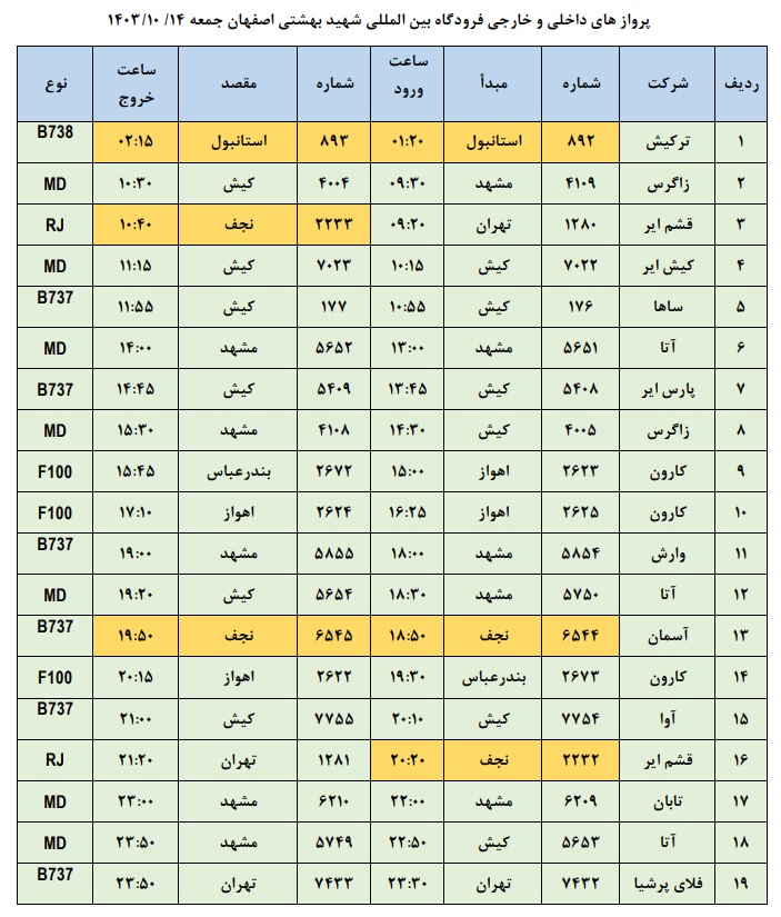 به گزارش نبض وطن، اطلاعات پروازهای داخلی و خارجی فرودگاه بینالمللی شهید بهشتی اصفهان امروز _پنجشنبه سیزدهم دی ماه_ به شرح زیر است: