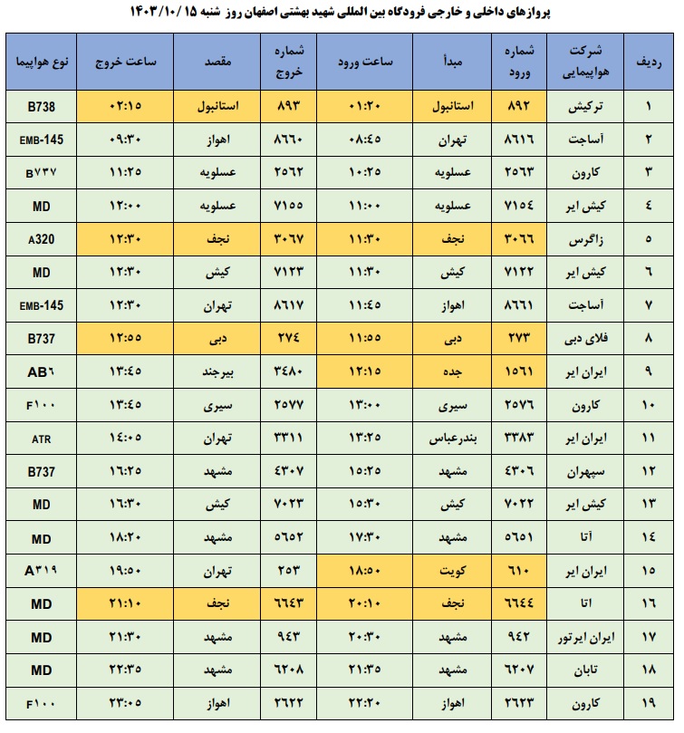 به گزارش نبض وطن، اطلاعات پروازهای داخلی و خارجی فرودگاه بینالمللی شهید بهشتی اصفهان امروز _شنبه پانزدهم دی ماه_ به شرح زیر است: