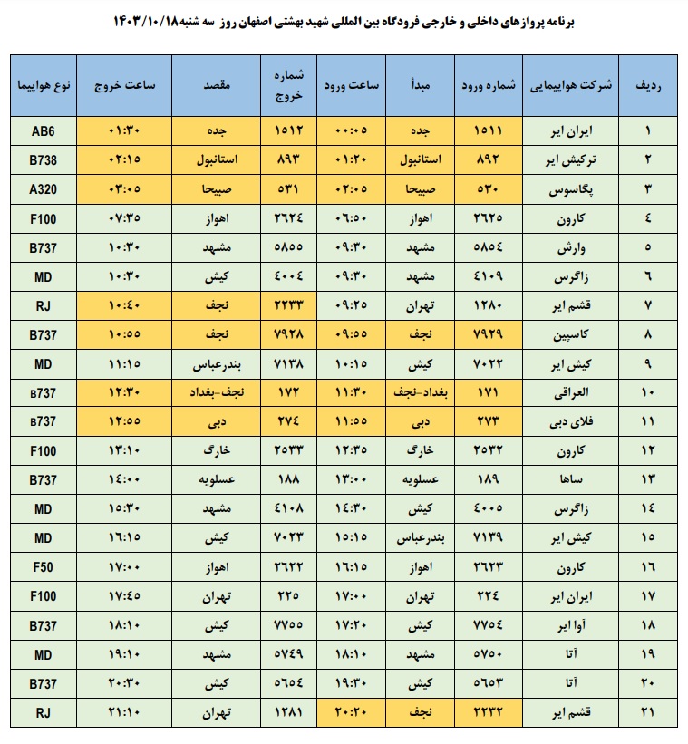 به گزارش نبض وطن، اطلاعات پروازهای داخلی و خارجی فرودگاه بینالمللی شهید بهشتی اصفهان امروز _سه شنبه هجدهم دی ماه_ به شرح زیر است: