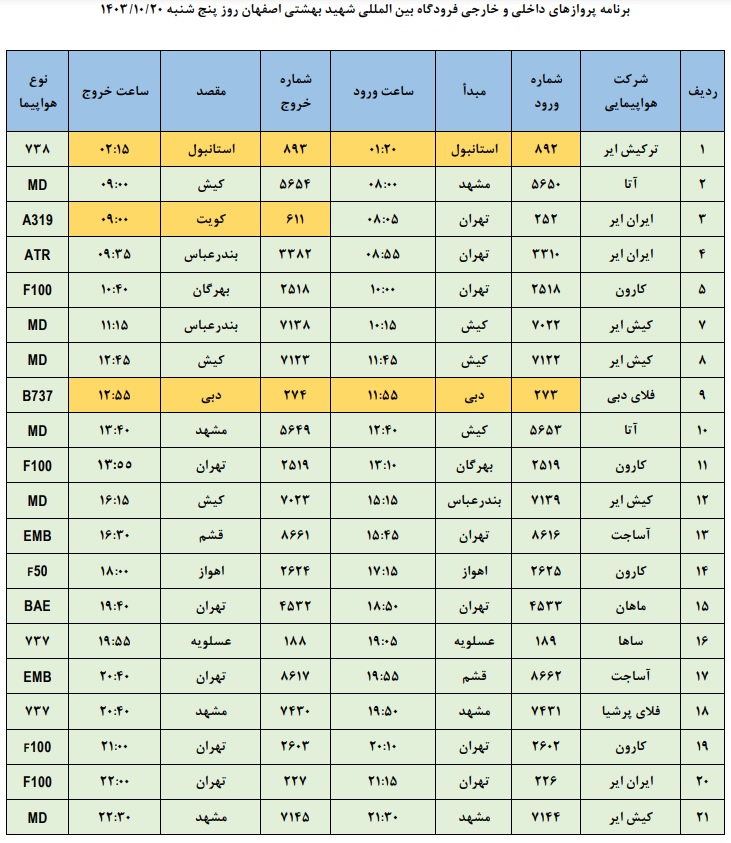 به گزارش نبض وطن، اطلاعات پروازهای داخلی و خارجی فرودگاه بینالمللی شهید بهشتی اصفهان امروز _پنجشنبه بیستم دی ماه_ به شرح زیر است: