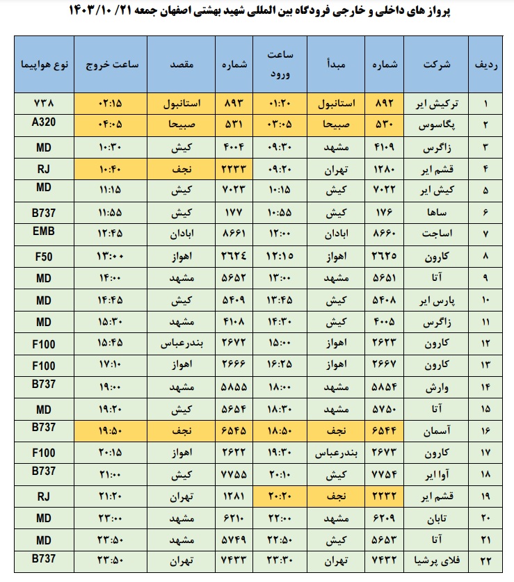 به گزارش نبض وطن، اطلاعات پروازهای داخلی و خارجی فرودگاه بینالمللی شهید بهشتی اصفهان امروز _جمعه بیست و یکم دی ماه_ به شرح زیر است: