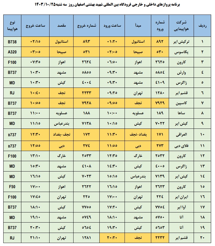 به گزارش نبض وطن، اطلاعات پروازهای داخلی و خارجی فرودگاه بینالمللی شهید بهشتی اصفهان امروز _سهشنبه بیست و پنجم دی ماه_ به شرح زیر است:
