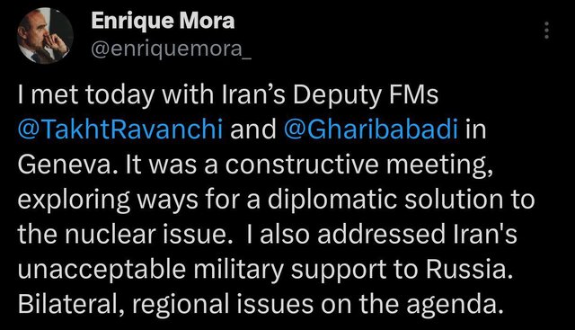 معاون هماهنگکننده اتحادیه اروپا افزود: «به حمایت نظامی غیر قابل قبول ایران از روسیه، مسائل دوجانبه و منطقهای نیز پرداختیم.»