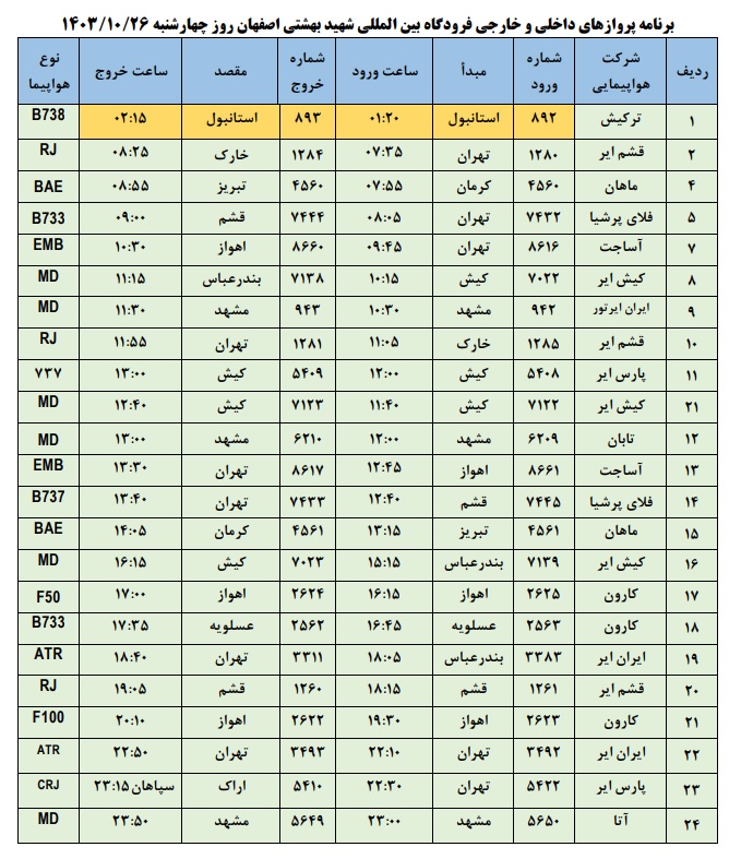 به گزارش نبض وطن، اطلاعات پروازهای داخلی و خارجی فرودگاه بینالمللی شهید بهشتی اصفهان امروز _چهارشنبه بیست و ششم دی ماه_ به شرح زیر است: