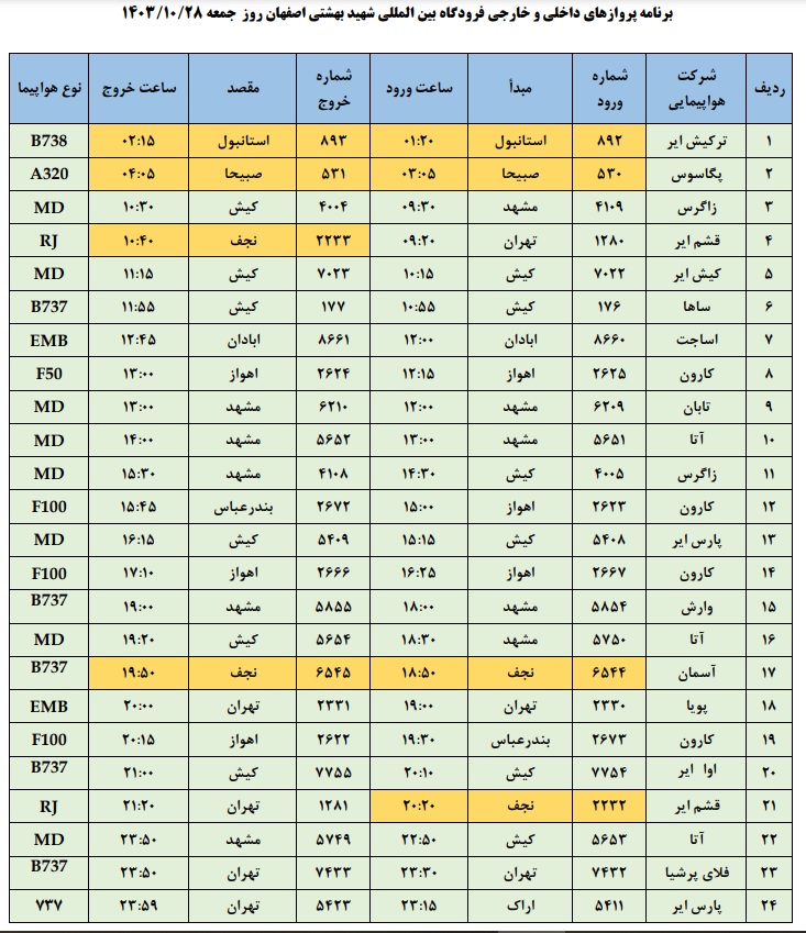 به گزارش نبض وطن، اطلاعات پروازهای داخلی و خارجی فرودگاه بینالمللی شهید بهشتی اصفهان امروز _جمعه بیست و هشتم دی ماه_ به شرح زیر است: