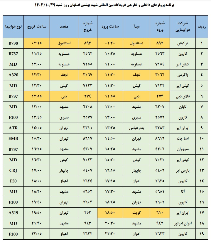 به گزارش نبض وطن، اطلاعات پروازهای داخلی و خارجی فرودگاه بینالمللی شهید بهشتی اصفهان امروز _شنبه بیست و نهم دی ماه_ به شرح زیر است:
