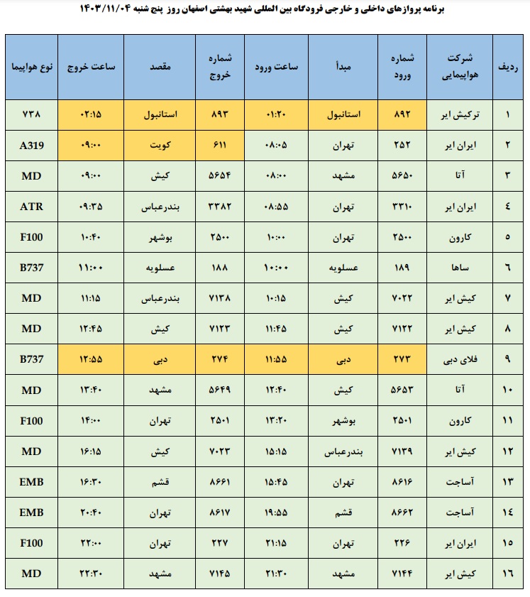 به گزارش نبض وطن، اطلاعات پروازهای داخلی و خارجی فرودگاه بینالمللی شهید بهشتی اصفهان امروز _پنجشنبه چهارم بهمن ماه_ به شرح زیر است: