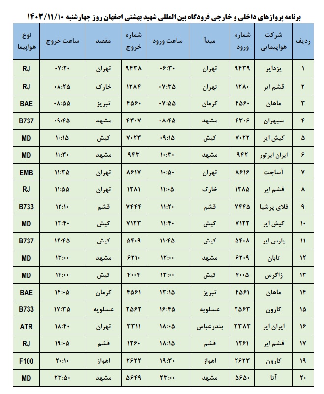 به گزارش نبض وطن، اطلاعات پروازهای داخلی و خارجی فرودگاه بینالمللی شهید بهشتی اصفهان امروز _چهارشنبه دهم بهمن ماه_ به شرح زیر است: