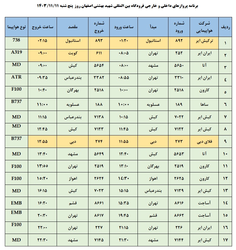 به گزارش نبض وطن، اطلاعات پروازهای داخلی و خارجی فرودگاه بینالمللی شهید بهشتی اصفهان امروز _پنجشنبه یازدهم بهمن ماه_ به شرح زیر است: