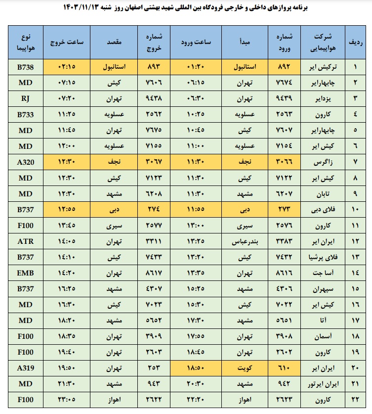 به گزارش نبض وطن، اطلاعات پروازهای داخلی و خارجی فرودگاه بینالمللی شهید بهشتی اصفهان امروز _شنبه سیزدهم بهمن ماه_ به شرح زیر است: