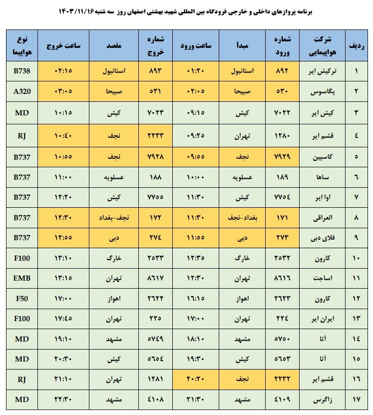 به گزارش نبض وطن، اطلاعات پروازهای داخلی و خارجی فرودگاه بینالمللی شهید بهشتی اصفهان امروز _سهشنبه شانزدهم بهمن ماه_ به شرح زیر است: