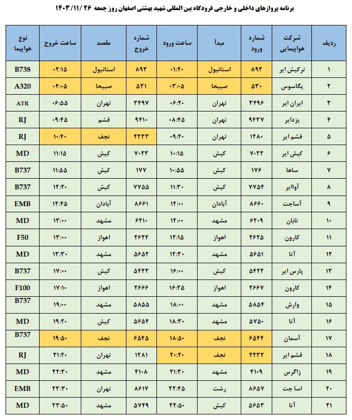 به گزارش نبض وطن، اطلاعات پروازهای داخلی و خارجی فرودگاه بینالمللی شهید بهشتی اصفهان امروز _جمعه بیست و ششم بهمن ماه_ به شرح زیر است: