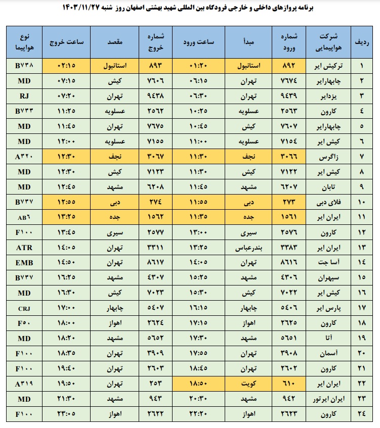 به گزارش نبض وطن، اطلاعات پروازهای داخلی و خارجی فرودگاه بینالمللی شهید بهشتی اصفهان امروز _شنبه بیست و هفتم بهمن ماه_ به شرح زیر است: