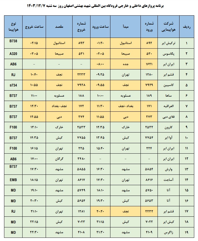 به گزارش نبض وطن، اطلاعات پروازهای داخلی و خارجی فرودگاه بینالمللی شهید بهشتی اصفهان امروز _سهشنبه هفتم اسفند ماه_ به شرح زیر است: