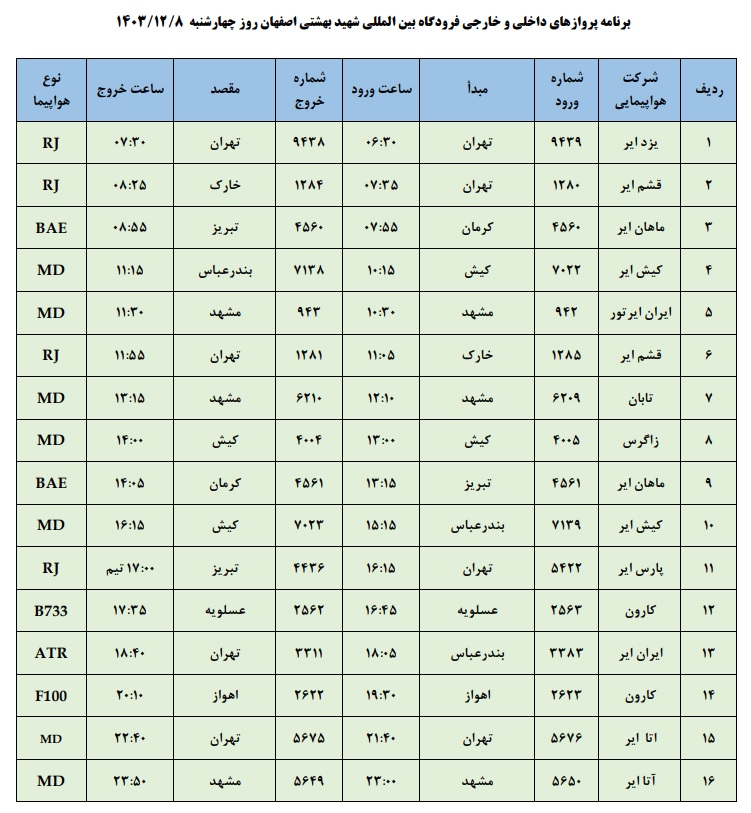 به گزارش نبض وطن، اطلاعات پروازهای داخلی و خارجی فرودگاه بینالمللی شهید بهشتی اصفهان امروز _چهارشنبه هشتم اسفند ماه_ به شرح زیر است:
