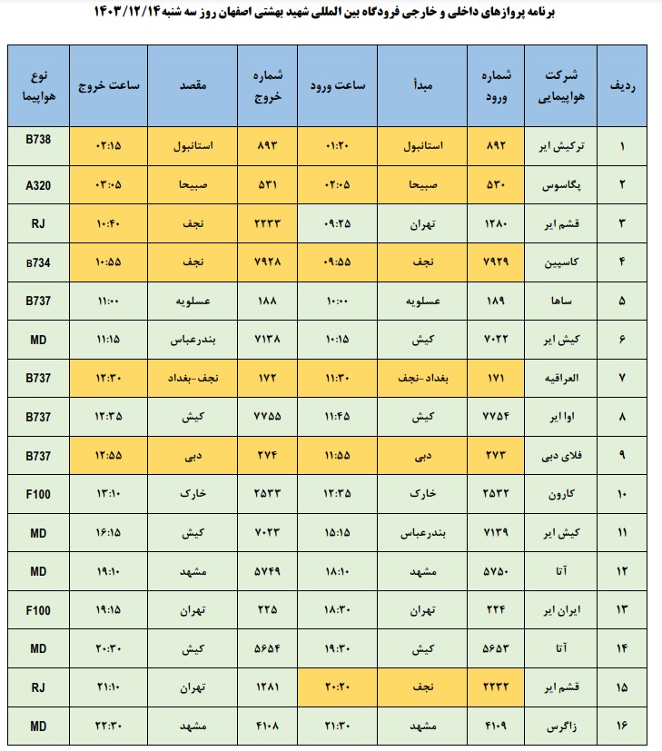 به گزارش نبض وطن، اطلاعات پروازهای داخلی و خارجی فرودگاه بینالمللی شهید بهشتی اصفهان امروز _سه شنبه چهاردهم اسفند ماه_ به شرح زیر است: