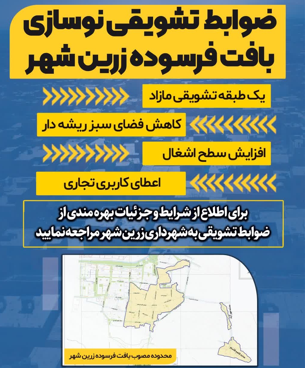 وی نوسازی بافتهای ناکارآمد شهری را تبدیل تهدید به فرصت دانست و افزود: بسته تشویقی ابلاغی کمیسیون ماده ۵ یک فرصت طلایی برای مالکان واحدهای فرسوده بهشمار میآید و ظرفیت بسیار خوبی برای نوسازی بافتهای فرسوده غیر تاریخی است و شهروندان ساکن در این بافتها میتوانند جهت اطلاع از جزئیات بیشتر و برخورداری از این فرصت به شهرداری زرینشهر مراجعه کنند.