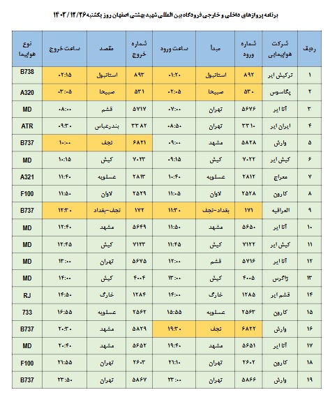 به گزارش نبض وطن، اطلاعات پروازهای داخلی و خارجی فرودگاه بینالمللی شهید بهشتی اصفهان امروز _یکشنبه بیست و ششم اسفند ماه_ به شرح زیر است:
