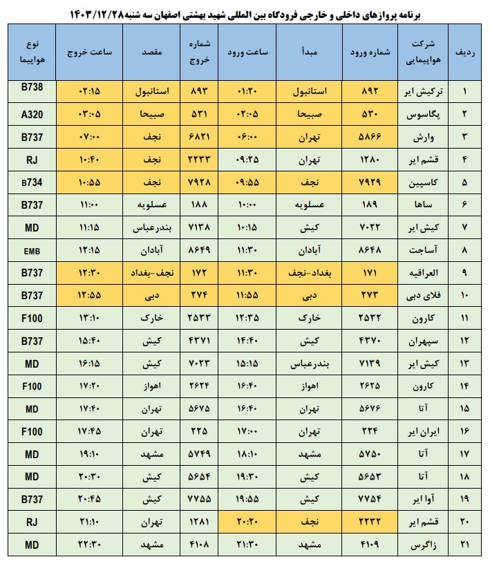 به گزارش نبض وطن، اطلاعات پروازهای داخلی و خارجی فرودگاه بینالمللی شهید بهشتی اصفهان امروز _سه شنبه بیست و هشتم اسفند ماه_ به شرح زیر است: