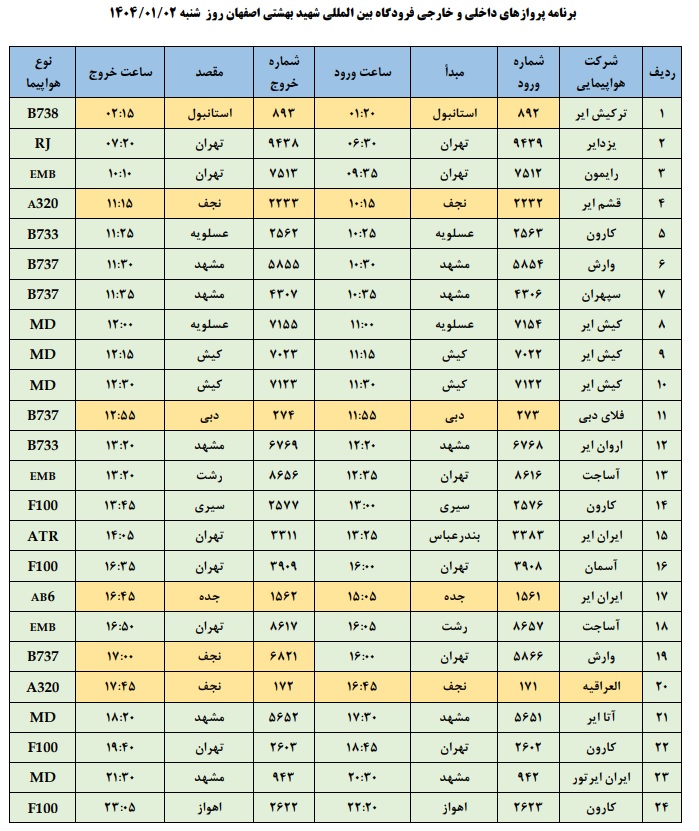 به گزارش نبض وطن، اطلاعات پروازهای داخلی و خارجی فرودگاه بینالمللی شهید بهشتی اصفهان امروز _شنبه دوم فروردین ماه_ به شرح زیر است: