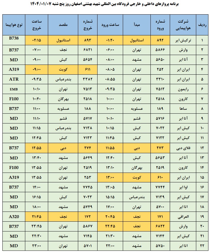 به گزارش نبض وطن، اطلاعات پروازهای داخلی و خارجی فرودگاه بینالمللی شهید بهشتی اصفهان امروز _پنجشنبه هفتم فروردین ماه_ به شرح زیر است:
