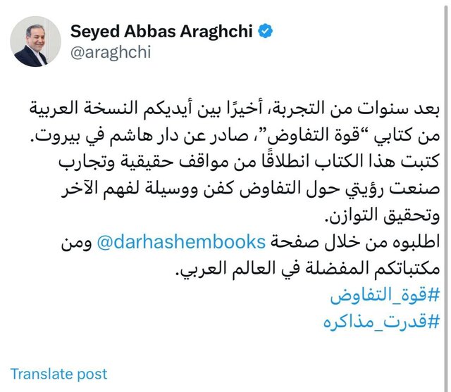 به گزارش نبض وطن، وزیر امور خارجه در این ارتباط در مطلبی به زبان عربی در شبکه اجتماعی ایکس نوشت: «نسخه عربی کتاب «قدرت مذاکره»، که ثمره سالها تجربه در سیاست خارجی است، توسط انتشارات دارهاشم در بیروت منتشر شد.»