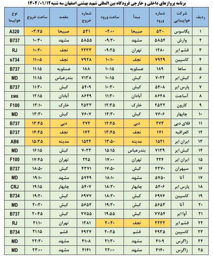 به گزارش نبض وطن، اطلاعات پروازهای داخلی و خارجی فرودگاه بینالمللی شهید بهشتی اصفهان امروز _دوشنبه یازدهم فروردین ماه_ به شرح زیر است: