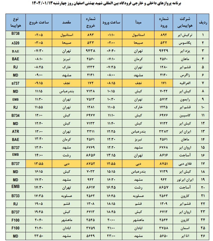 به گزارش نبض وطن، اطلاعات پروازهای داخلی و خارجی فرودگاه بینالمللی شهید بهشتی اصفهان امروز _چهارشنبه سیزدهم فروردین ماه_ به شرح زیر است: