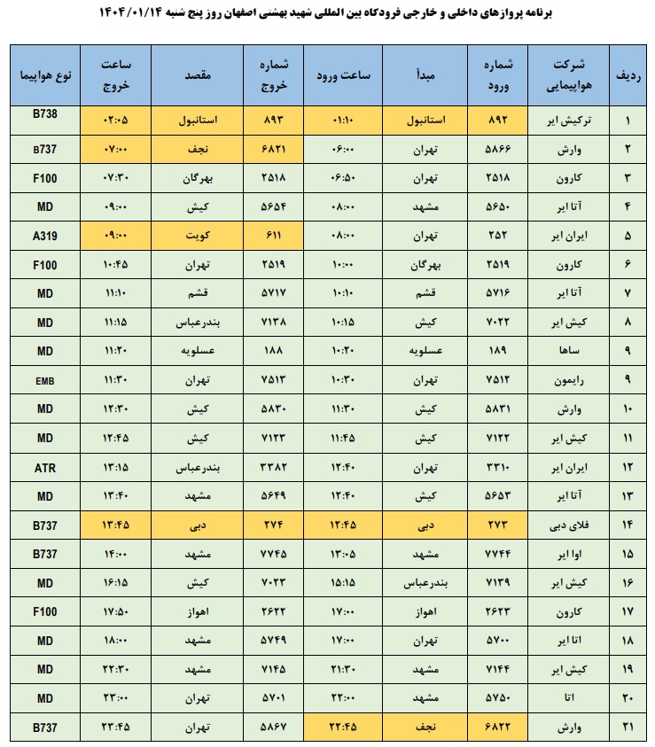 به گزارش نبض وطن، اطلاعات پروازهای داخلی و خارجی فرودگاه بینالمللی شهید بهشتی اصفهان امروز _پنجشنبه چهاردهم فروردین ماه_ به شرح زیر است: