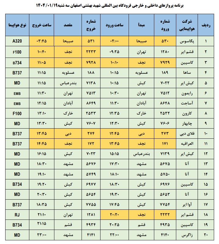 به گزارش نبض وطن، اطلاعات پروازهای داخلی و خارجی فرودگاه بینالمللی شهید بهشتی اصفهان امروز _سه شنبه نوزدهم فروردین ماه_ به شرح زیر است:
