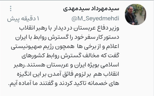 وزیر دفاع عربستان در دیدار با رهبر انقلاب دستور کار سفر خود را گسترش روابط با ایران اعلام کرد و از برخی ها همچون رژیم صهیونیستی گفت که مخالف گسترش روابط کشورهای اسلامی بویژه ایران و عربستان هستند.رهبر انقلاب هم بر لزوم فائق آمدن بر این انگیزههای خصمانه تاکید کردند و گفتند ما آمادهایم.
