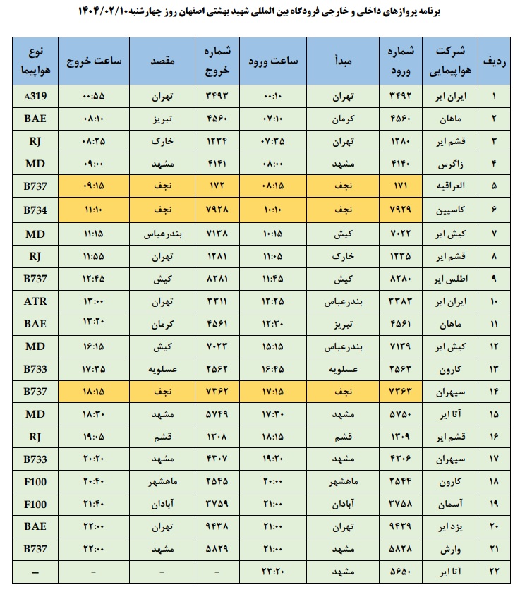 به گزارش نبض وطن، اطلاعات پروازهای داخلی و خارجی فرودگاه بینالمللی شهید بهشتی اصفهان امروز _ چهارشنبه دهم اردیبهشت ماه_ به شرح زیر است: