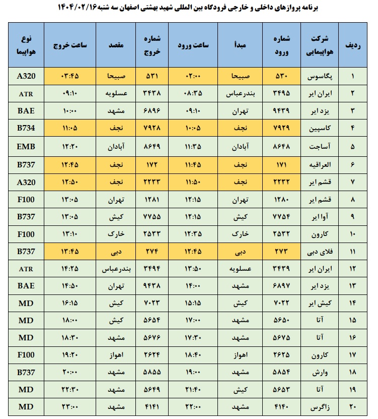 به گزارش نبض وطن، اطلاعات پروازهای داخلی و خارجی فرودگاه بینالمللی شهید بهشتی اصفهان امروز _سهشنبه شاتزدهم اردیبهشت ماه_ به شرح زیر است: