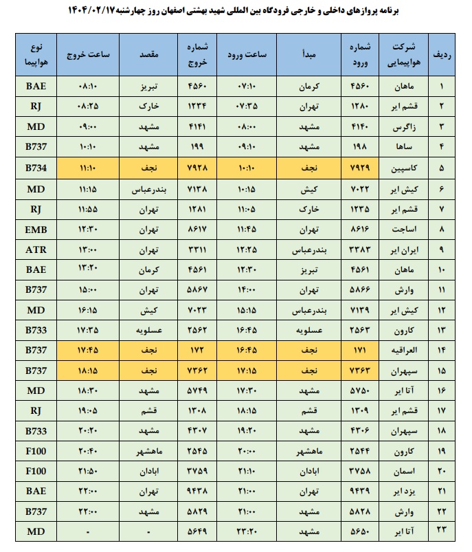 به گزارش نبض وطن، اطلاعات پروازهای داخلی و خارجی فرودگاه بینالمللی شهید بهشتی اصفهان امروز _چهارشنبه هفدهم اردیبهشت ماه_ به شرح زیر است: